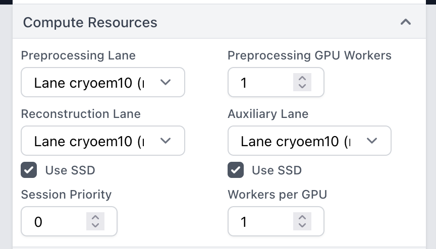 CryoSPARC Live will automatically schedule a Streaming 2D Classification and Streaming Refinement job when requested on the lane selected here. Each reconstruction job (Streaming 2D Classification, Streaming 3D Refinement) will allocate one GPU to its main process and use this continuously as new particles arrive. Therefore, the minimum required GPUs for this lane is **two**. In the case where the lane selected here does **not** have more than one GPU available when the job is queued, the CryoSPARC scheduler will still automatically schedule reconstruction jobs to the lane as resources become available. Since these jobs hold resources indefinitely, any other `queued` jobs that are waiting for resources in this lane may remain indefinitely in the queue until the Session is paused or the reconstruction job is manually stopped.