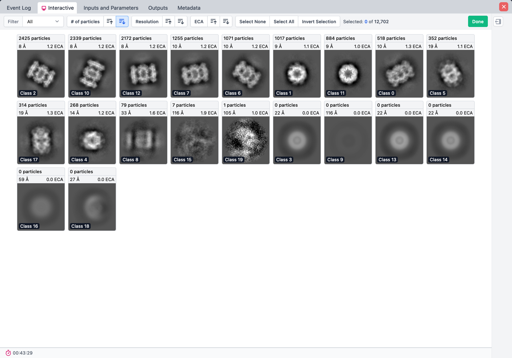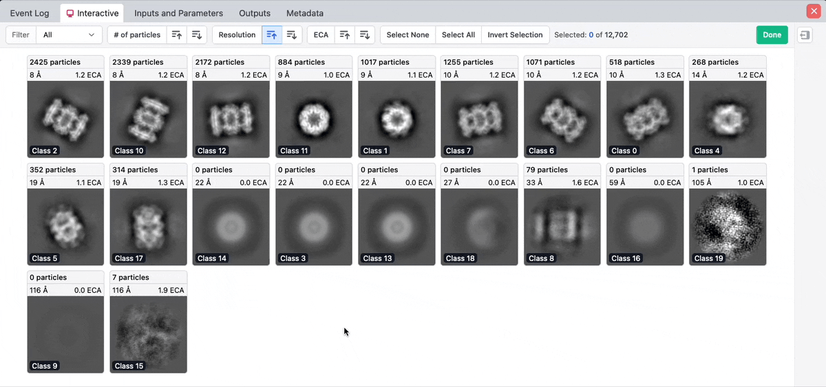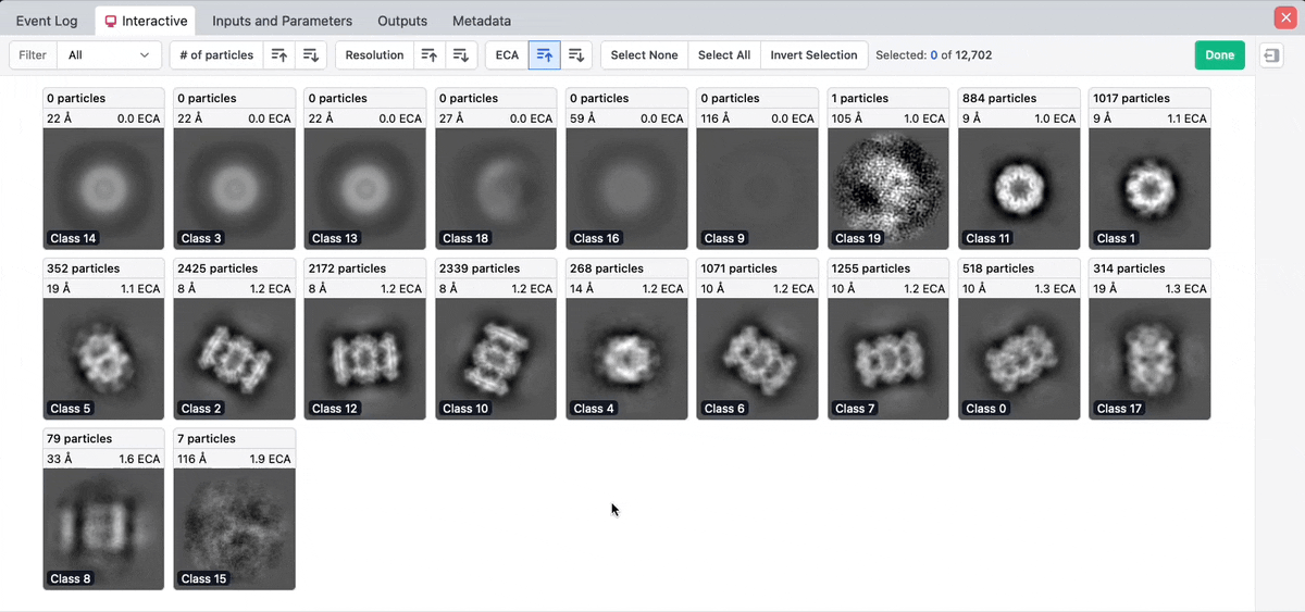 Buttons in the top toolbar allow you to sort the class averages by number of particles, resolution, or ECA in ascending or descending order: