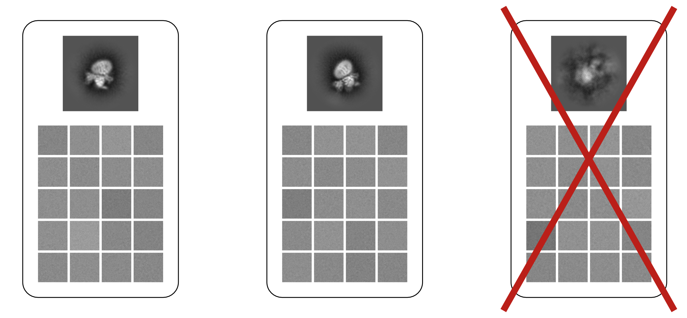 In general, it is exceedingly difficult to assess the quality of individual single particle cryo-EM images; low signal level, high noise, and unknown particle pose make it challenging to determine if an intact particle is present in each image. However, when particles have been grouped and aligned in a 2D Classification job, the quality of those class averages can be more readily apparent.