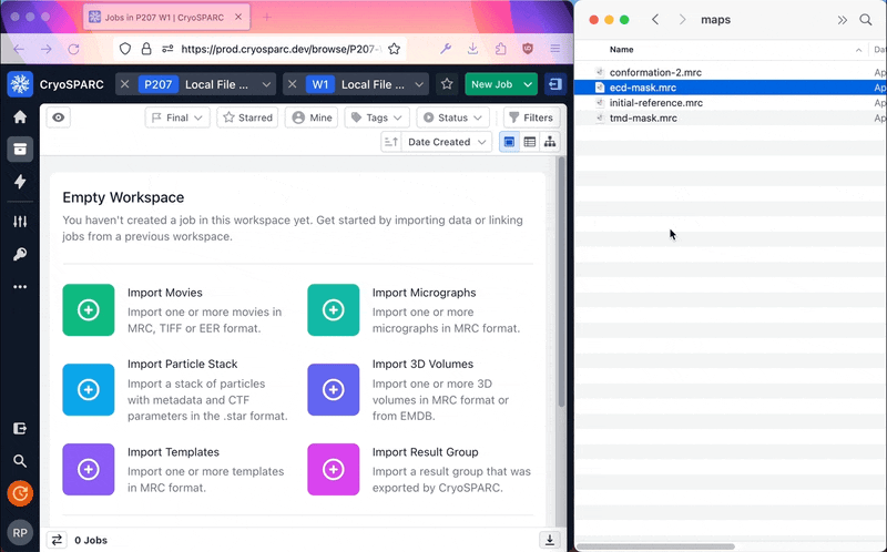 All volumes and masks need to be within your filesystem including reference volumes, junk volumes, and masks, but they do not necessarily need to be located within the project where you intend to launch the automation workflow. The easiest way to upload files from your local filesystem to your compute infrastructure for use within CryoSPARC is to drag the file (or multiple files) to any CryoSPARC browser window: