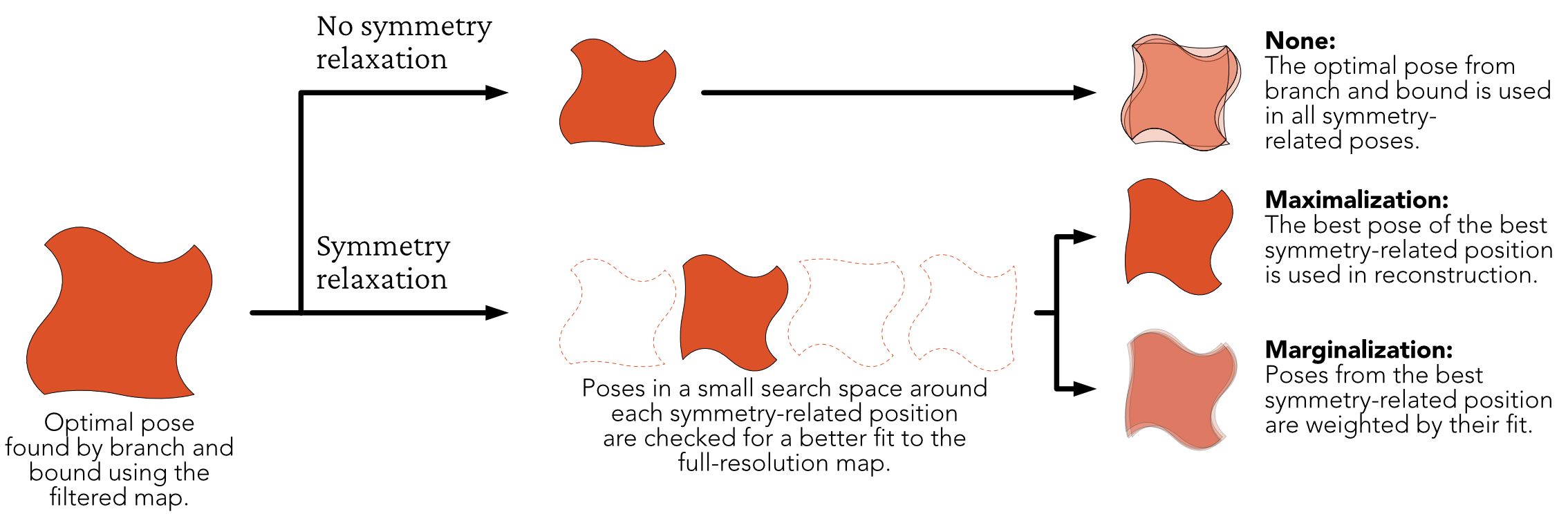 * `marginalization`: This option enables symmetry relaxation via marginalization. Once the BnB-optimal pose is found, the alignment objective will be evaluated over a small search radius covering each of the N symmetry-related modes. The single optimal mode will be carried forward to the reconstruction step, and each pose within the search radius will be weighted during backprojection by its normalized posterior probability.