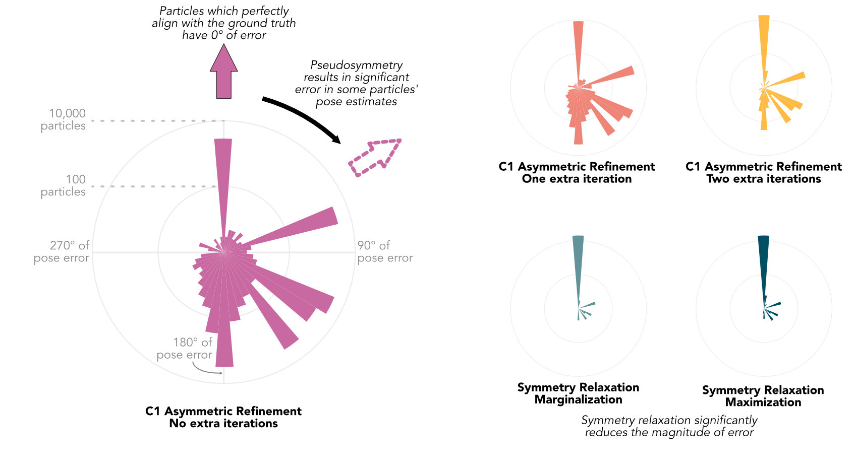<figure><img src="https://1916621962-files.gitbook.io/~/files/v0/b/gitbook-x-prod.appspot.com/o/spaces%2F-M7DGv3GkRvGGpbVPCgg%2Fuploads%2FIiYQxg3giWpB2qpfUkht%2Fv4-4-0-symrelax-poseerror-compare.png?alt=media&#x26;token=113dbd86-7f2d-49bb-8ea4-32686b078962" alt=""><figcaption><p>Comparison of the magnitude of the pose error between the ground truth pose and the pose found by Branch and Bound. Each polar-plot histogram displays the number of particles with a given pose error, which starts at 0º at the 12 o’clock position, and increases clockwise. Pose errors are displayed for standard asymmetric refinement (SAR) with 0, 1, and 2 extra iterations (in purple, orange, and yellow, respectively). Both symmetry relaxation methods are displayed in the lower right hand, showing that either symmetry relaxation method better recovers the ground truth for the majority of particles, compared to asymmetric refinement.</p></figcaption></figure>