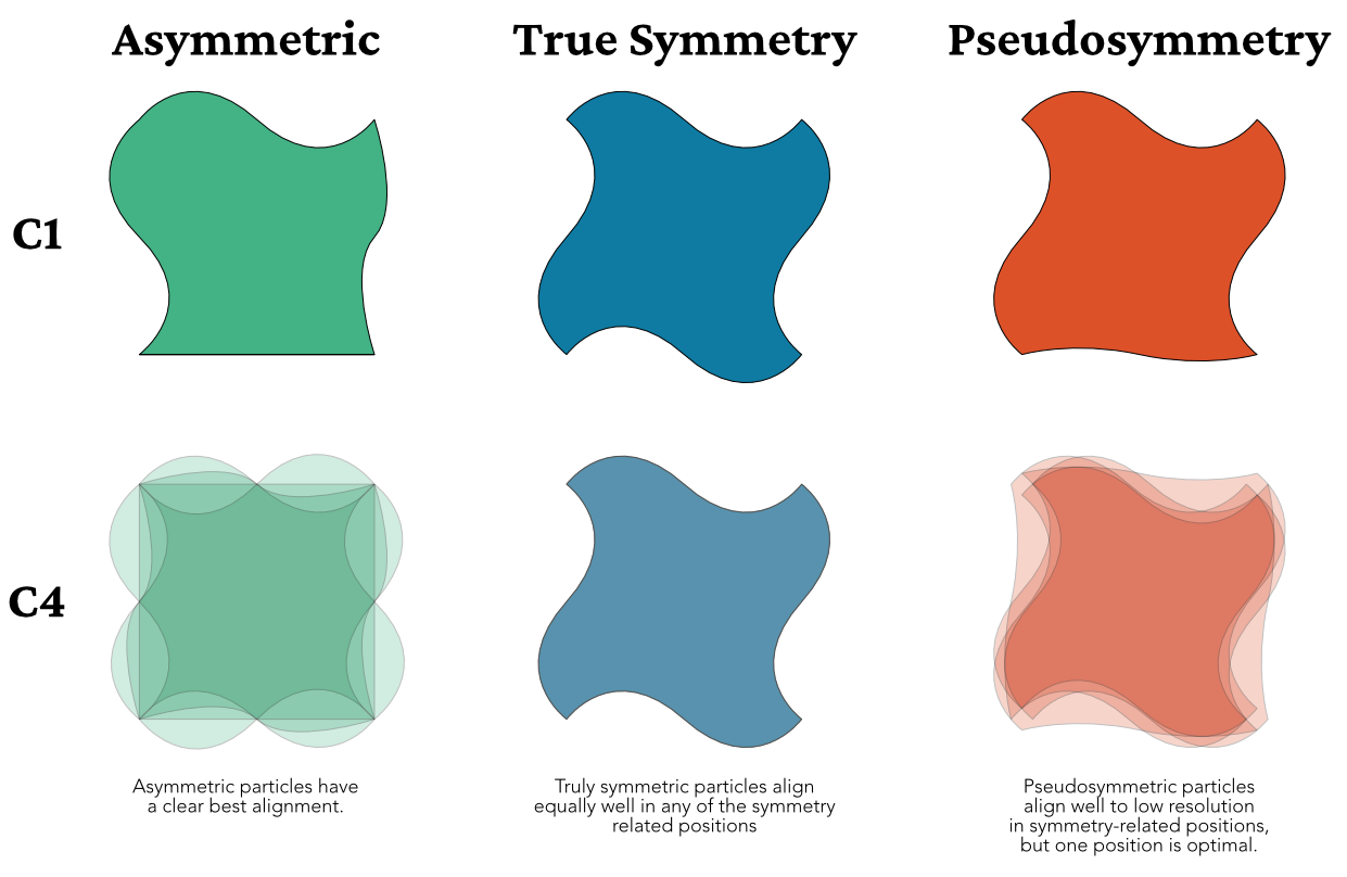 Where this strategy encounters difficulties is with nearly symmetric molecules. There are many terms used to refer different forms of approximate symmetries, including pseudosymmetry, symmetry-mismatches, or symmetry-breaking features. An excellent characterization of different forms of these symmetries is presented in [Huiskonen, 2018](https://portlandpress.com/bioscirep/article/38/2/BSR20170203/57149/Image-processing-for-cryogenic-transmission). Pseudosymmetric particles may have several plausible poses at low resolution, and the correct pose may only be distinguishable if each of the symmetry-related poses are compared directly. The discretization of the pose search space used by CryoSPARC provides no guarantee that the symmetry-related poses are compared directly, unless symmetry relaxation is activated (as described in the subsequent section).