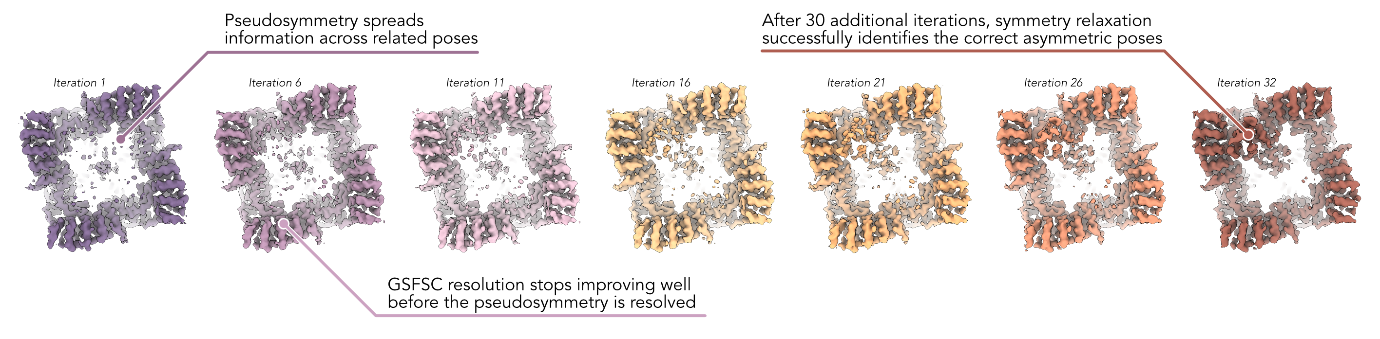 <figure><img src="https://1916621962-files.gitbook.io/~/files/v0/b/gitbook-x-prod.appspot.com/o/spaces%2F-M7DGv3GkRvGGpbVPCgg%2Fuploads%2FGvHlgXGIBaYF9OFXpuep%2Fv4-4-0-symrelax-comparison-sidebyside.png?alt=media&#x26;token=b4f944f9-9d75-45ed-99d7-eaec2c036423" alt=""><figcaption><p>Standard Asymmetric Refinement (SAR, in gray) compared to symmetry relaxation (SR) via maximization (in <mark style="color:yellow;">yellow</mark>) and via marginalization (in <mark style="color:blue;">blue</mark>). Note how the volume reconstructed using symmetry relaxation has resolved the internal RNA helices stretching across the inside of the viral capsid.</p></figcaption></figure>