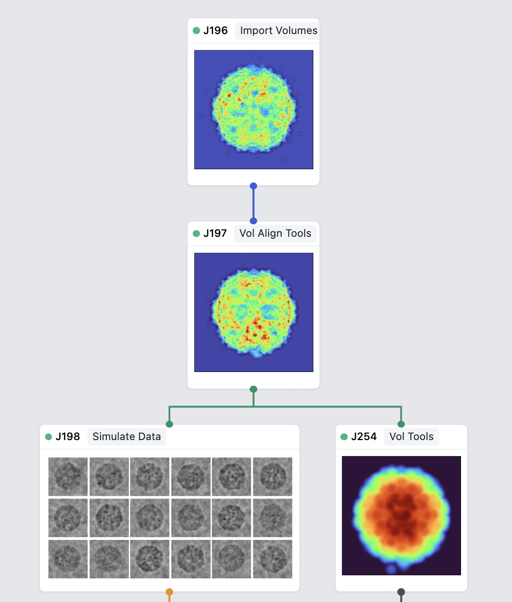 Next, we’ll generate the synthetic data using the [Simulate Data job](https://guide.cryosparc.com/processing-data/all-job-types-in-cryosparc/simulations). Connect the aligned volume to Simulate Data, and simulate 20,000 particles at the default signal-to-noise ratio. We will also use [Volume Tools](https://guide.cryosparc.com/processing-data/all-job-types-in-cryosparc/utilities/job-volume-tools) to generate a mask (via thresholding, dilating, and padding) the aligned volume to be used downstream during refinement. Our workflow thus far is included below.
